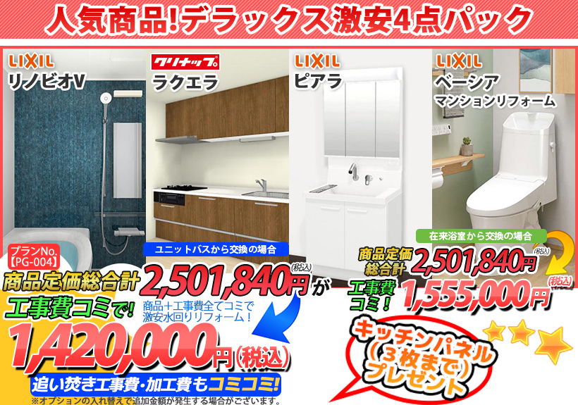 『水回り4点パック』が商品×工事費全てコミで激安価格。