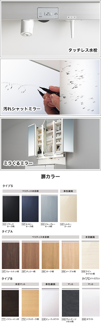 人気の洗面化粧台ウツクシーズは、キレイをつくる4つのアイテムをご用意。影をつくらず、顔全体をしっかり照らす「美ルックツインラインLED照明」、手を近づけるだけで、すぐ水が出る、止まる、「タッチレス水栓」、美容家電も化粧小物もすっきり収納「すっきり家電収納」、汚れにくくお掃除ラクラク「スゴピカカウンター」が、お客様のキレイをお手伝いします。ミラくるミラーは体を乗り出さず手前に引き出せて細かい作業も楽な姿勢でおこなえます。また、高さ1800mmの梁にも対応する3面鏡も登場しリフォームでの使い勝手もより高まっています。オネストラインでは評判のウツクシーズを激安特価44%OFFでご案内中!商品代+工事費を含めても安い!工事業者比較で迷われてる方も是非一度無料お見積りにお問い合わせください。お電話でのお問い合わせ・ご相談は 042-700-1168